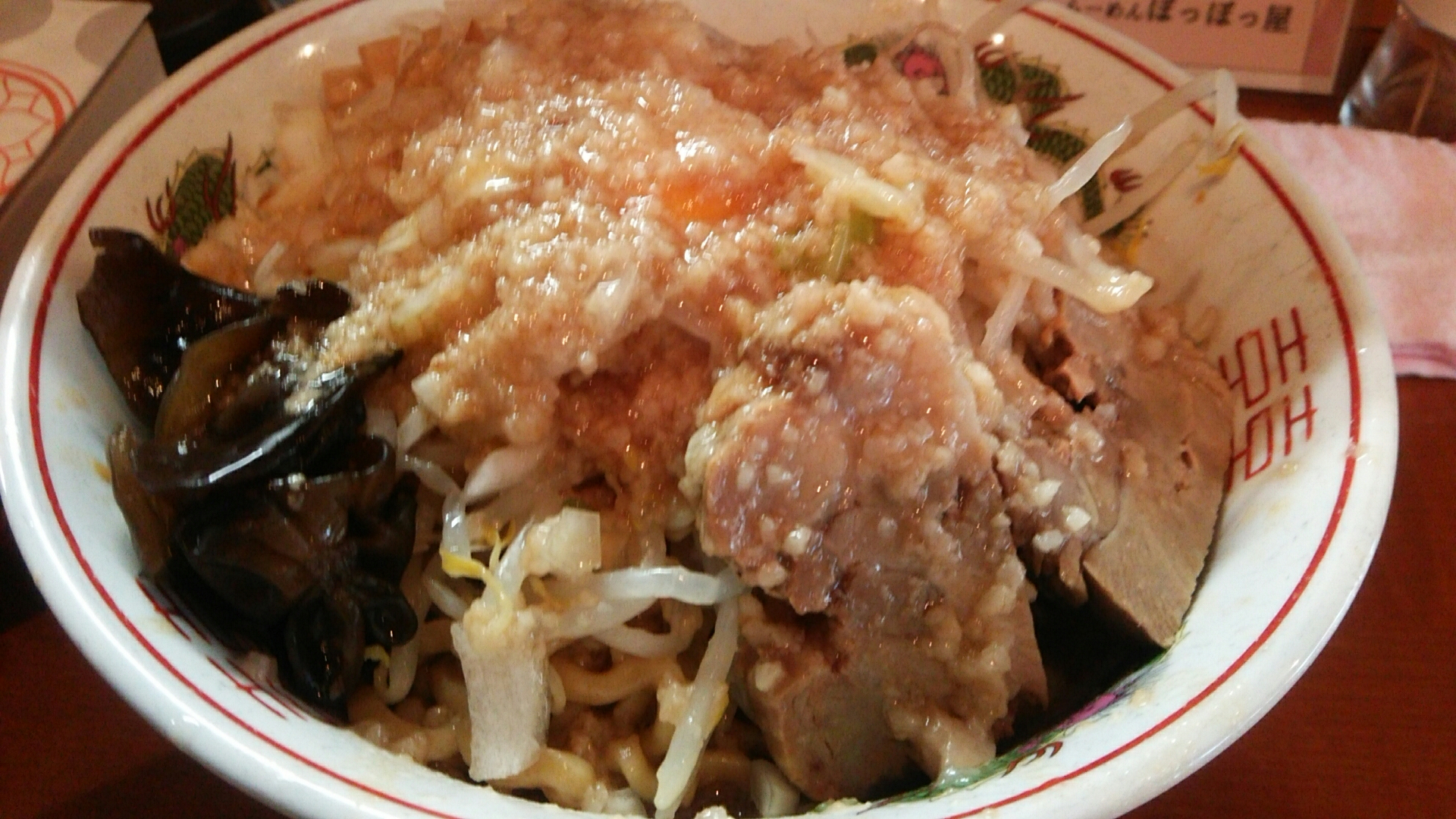 玉ねぎ多め、背脂多め、旨み脂をトッピング。
