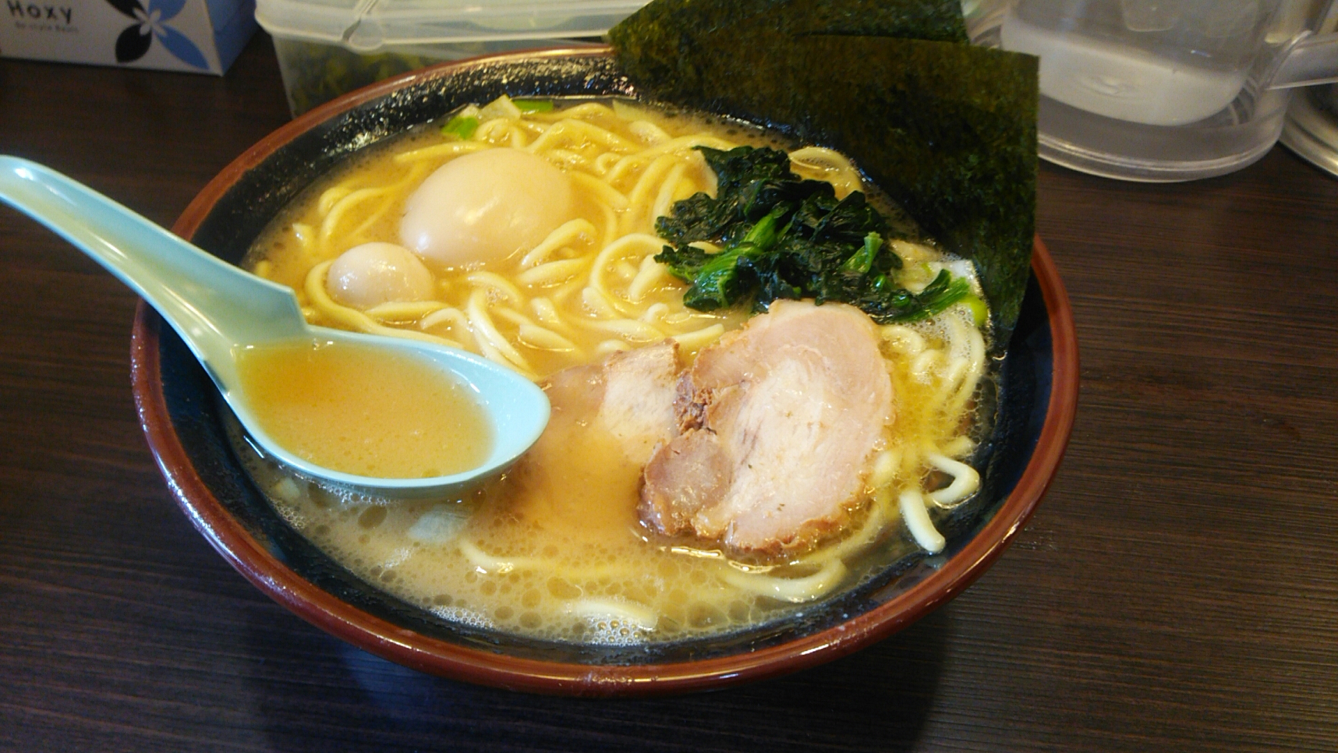 トッピングは、デフォでチャーシュー、ほうれん草と海苔が